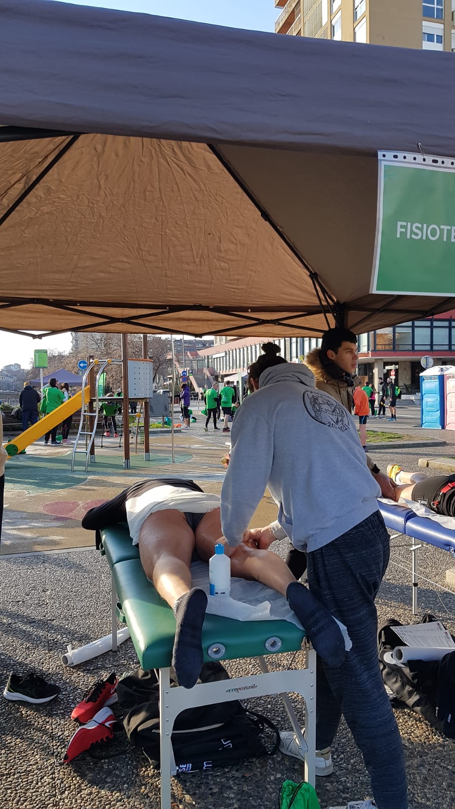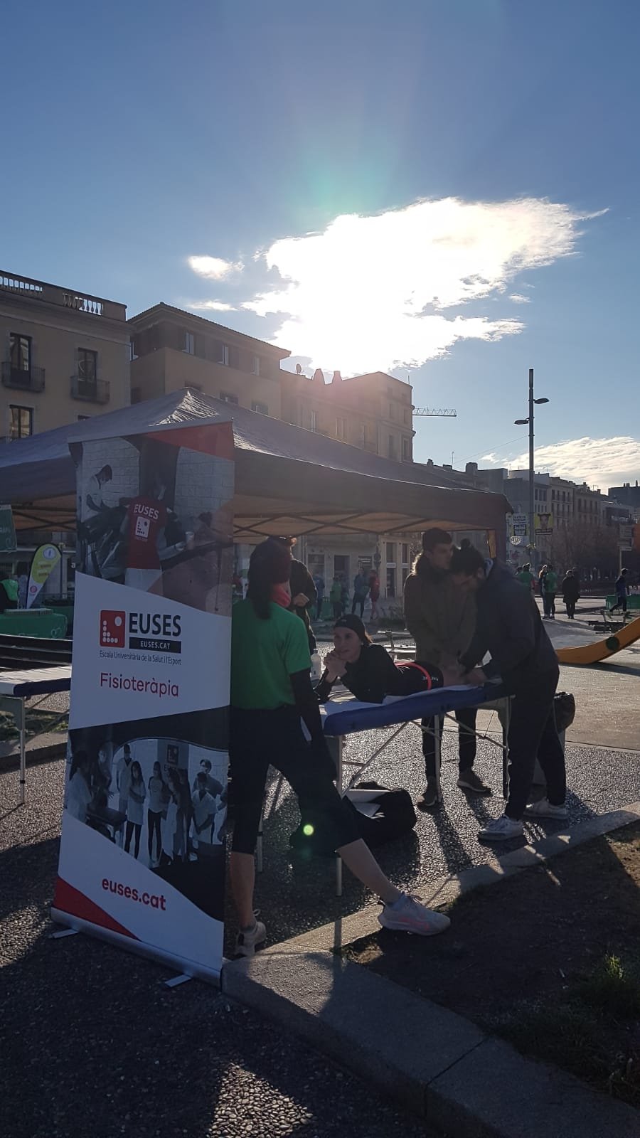L’Escola Universitària de la Salut i l’Esport ha estat present en la novena edició de la Tradeinn cursa Girona en marxa contra el càncer, que s’ha celebrat aquest diumenge al matí pel centre de la ciutat.. La prova, organitzada per l’Associació contra el Càncer a Girona, ha constat d’una caminada de 6,5 quilòmetres, una cursa de 5 quilòmetres i diferents curses infantils. Al final de la mateixa, i en una zona habilitada a l’arribada, a la Plaça de Catalunya, l’organitació ha instal·lat un servei de recuperació on, sota la supervisió de la  fisioterapeuta Cristina Pallarols, els alumnes del Grau en Fisioteràpia de l’EUSES Ulises Sánchez, Hugo Van Belleghem i Benjamin Picard han realitzat als participants tècniques de recuperació muscular com massatges i estiraments.