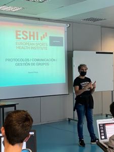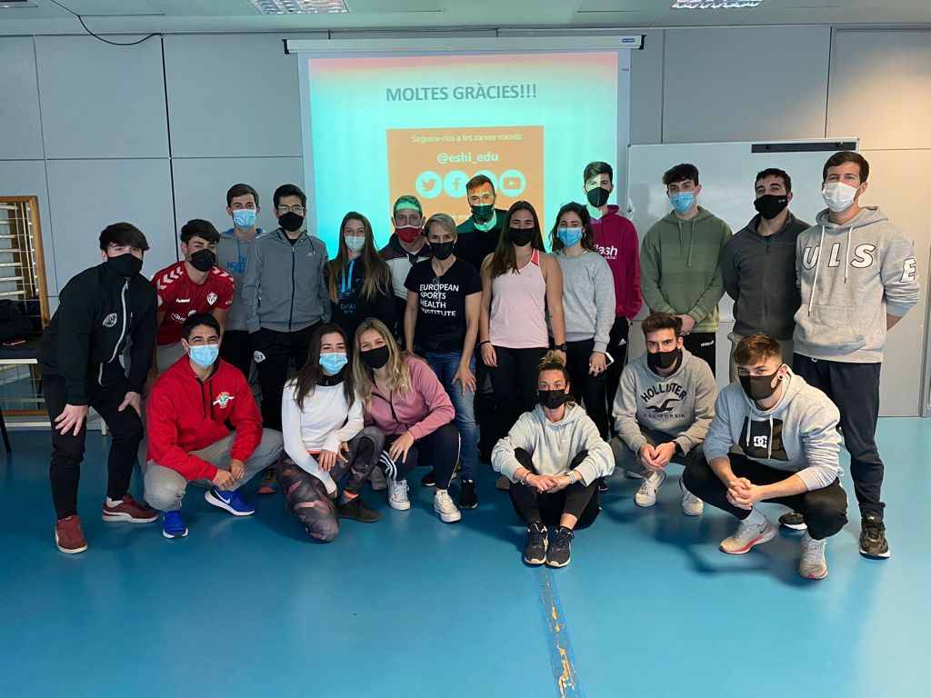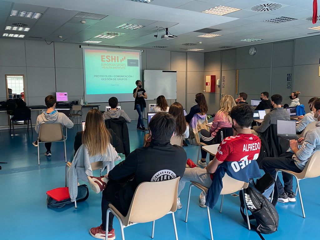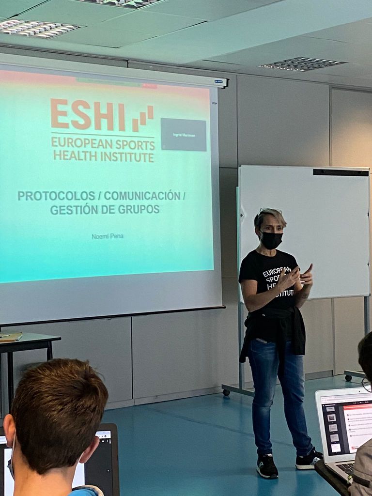 Els estudiants de 3r curs del Grau en Ciències de l’Activitat Física i de l’Esport han pogut gaudir de la visita de Noemí Pena, coordinadora acadèmica d’ESHI (European Sports Health Institute) i professional del Fitness, que ha impartit una sessió  de protocol d’activitats. La classe, que s’ha pogut fer presencialment seguint estrictament totes les mesures sanitàries de prevenció per al Covid-19, ha estat emmarcada dins l’assignatura de noves tendències de l’entrenament que imparteix la professora Esther Hernàndez.  ESHI és una escola de formació especialitzada en Fitness, exercici físic i salut que té tres seus i diversos centres de formació en tot l’estat espanyol.