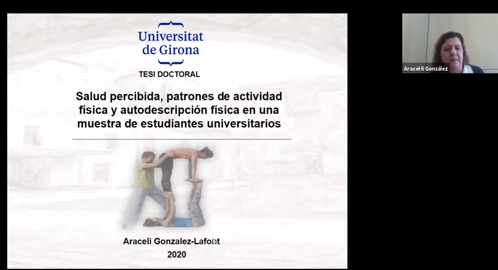 La Dra. Araceli González ha desenvolupat la temàtica: “Salut percebuda, patrons d’activitat física i autodescripció física en una mostra d’estudiants universitaris”, en la qual ha fet una acurada explicació de la investigació i les conclusions de la que va ser la seva tesi doctoral. A l’EUSES, la Dra. Araceli González imparteix les assignatures de “Legislació esportiva i direcció de sistemes i organitzacións” (2n curs) i “Instal·lacions esportives” (3r curs).
