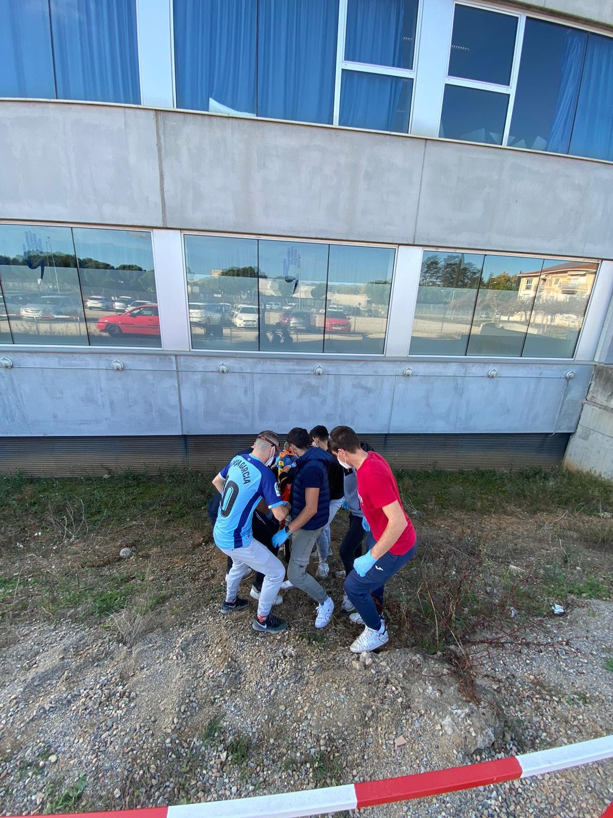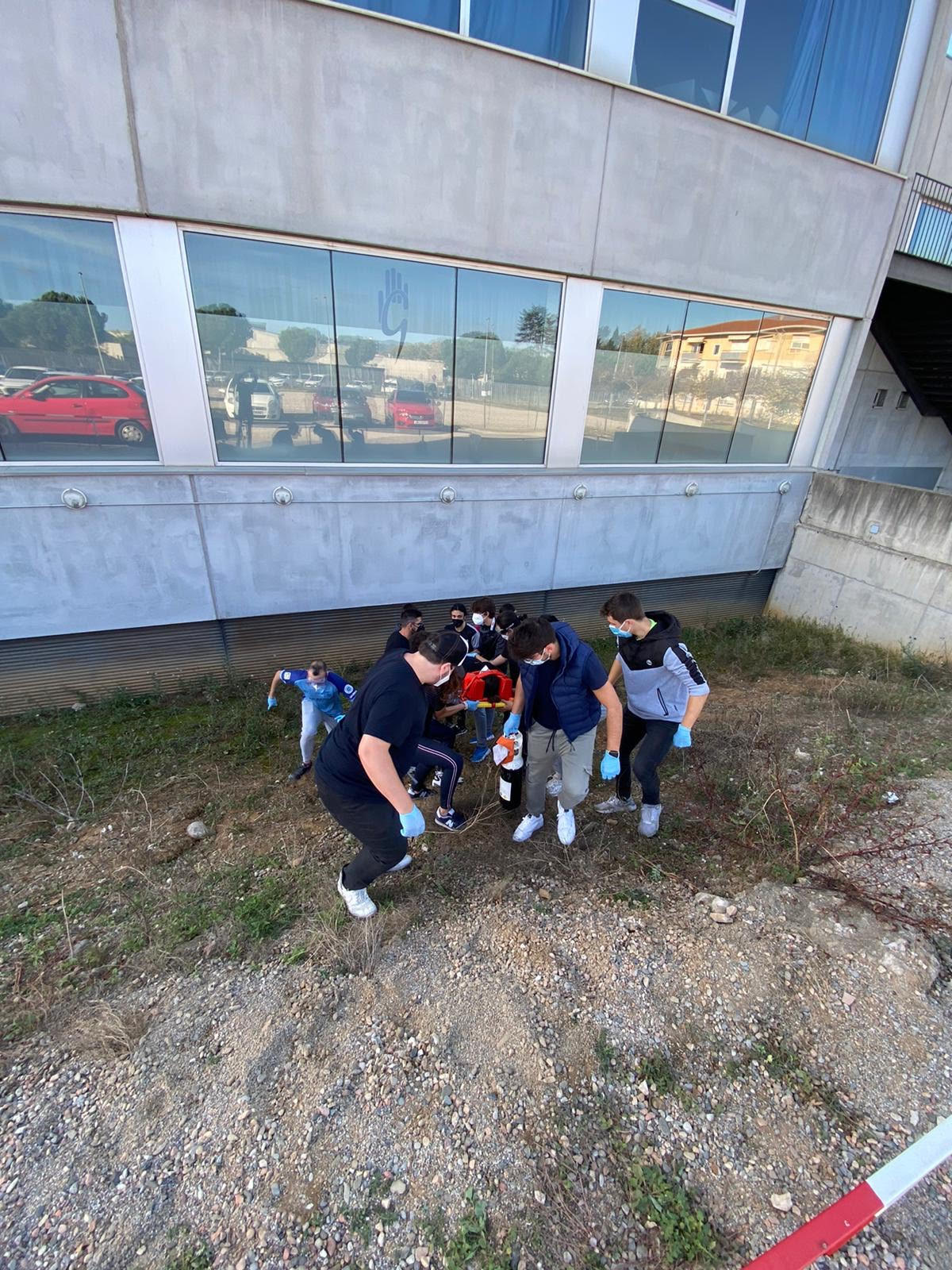 Pràctica de mobilització d’un pacient amb lesió cervical en terreny abrupte dels alumnes de TES