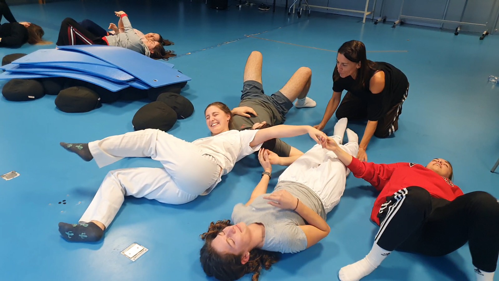 Pràctica de percepció corporal i sensitiva de la professora de CAFE Glòria Rovira dirigida als alumnes de Fisioteràpia