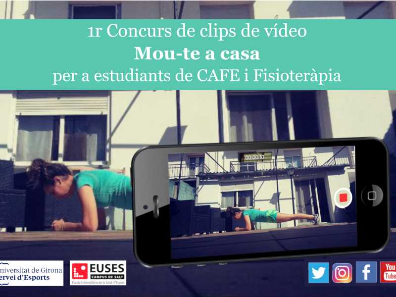 Aquest divendres dia 8 de maig s’acaba el termini per presentar els treballs del 1r concurs de de clips de vídeo “Mou-te a casa”, que està adreçat a tots els estudiants dels graus en CAFE i en Fisioteràpia de les 22 universitats de la Xarxa Vives. Aquesta activitat està organitzada pel Servei d’Esports de la Universitat de Girona, amb la col·laboració de l’Escola Universitària de la Salut i l’Esport.