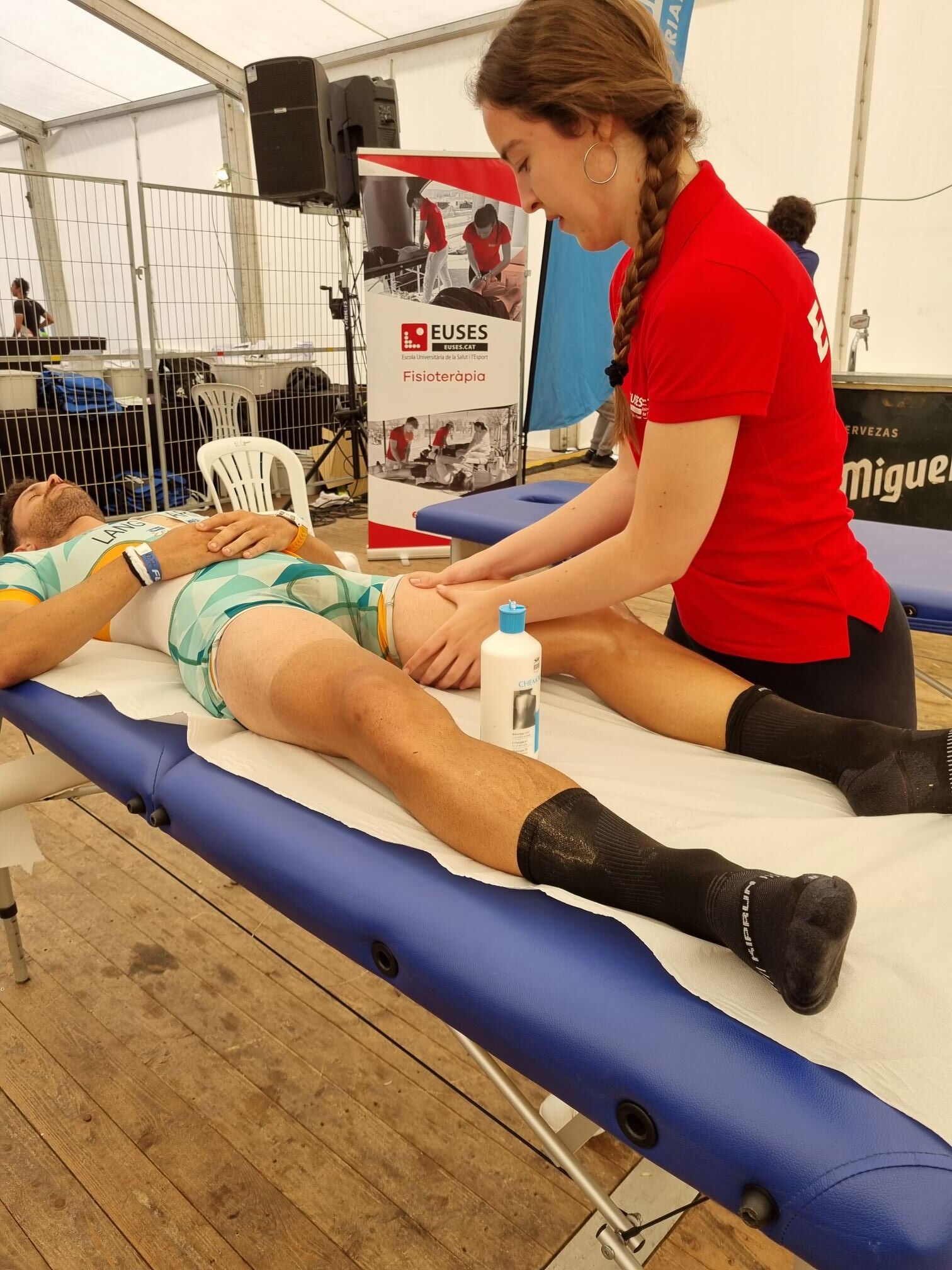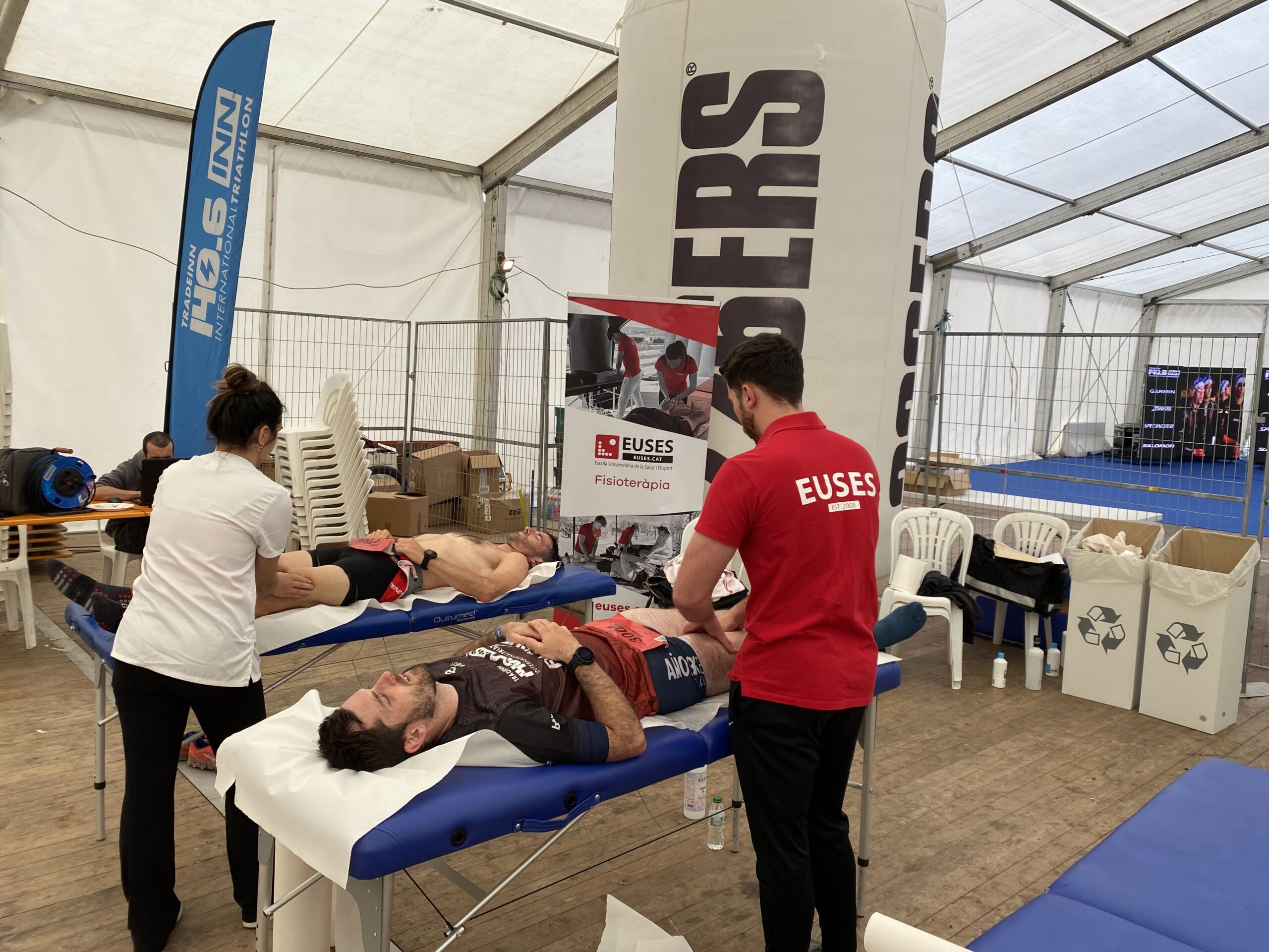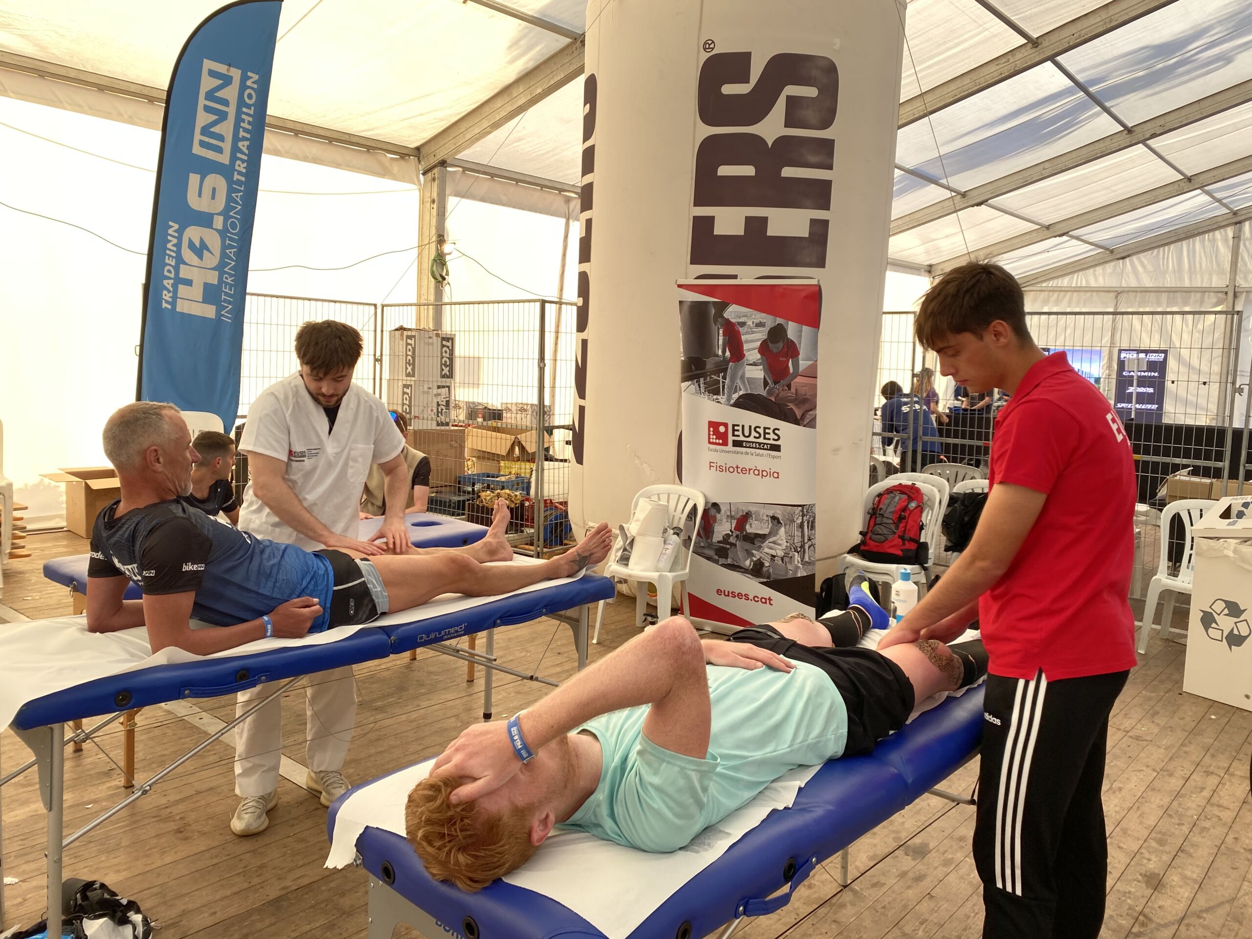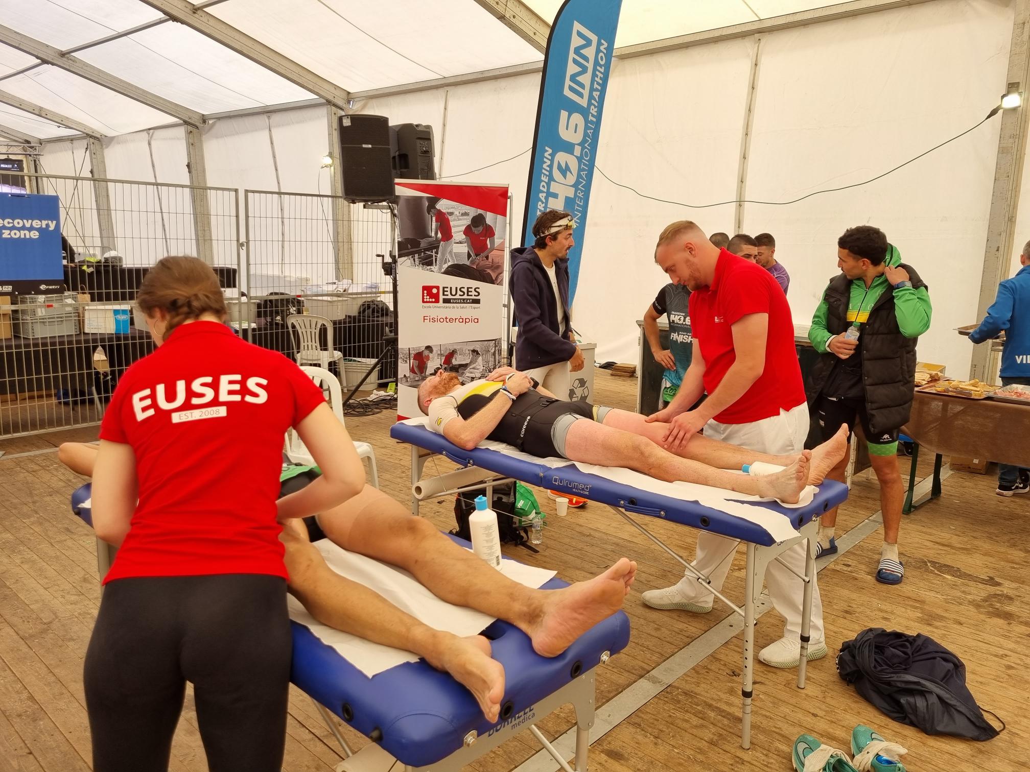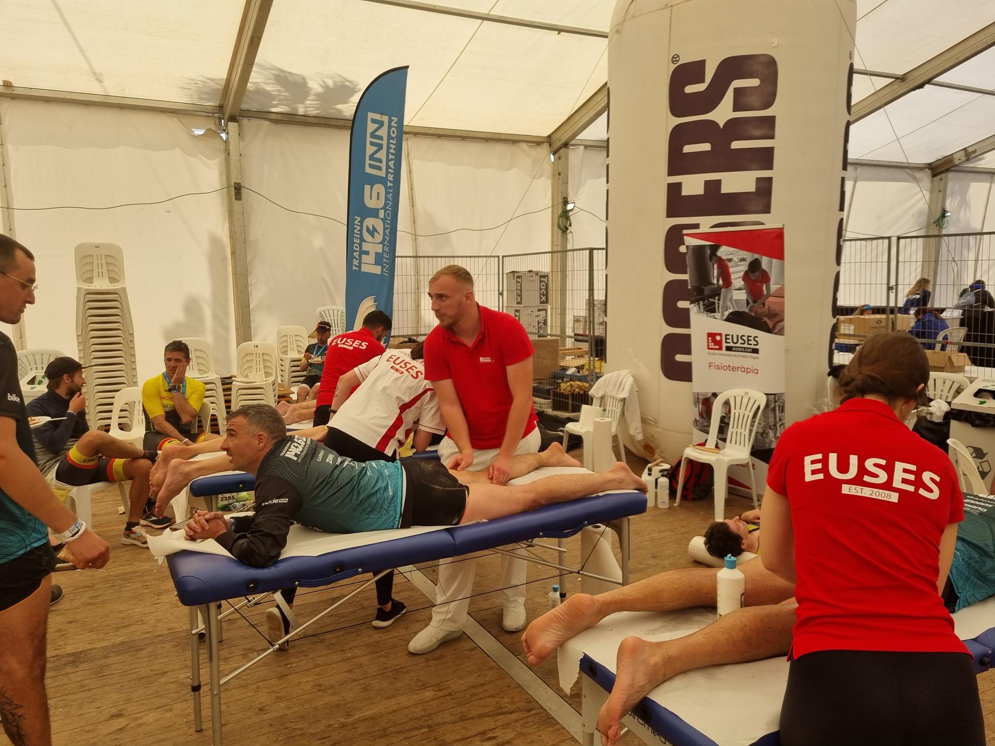 L’Escola Universitària de la Salut i l’Esport s’ha abocat amb la 140.6INN, un esdeveniment organitzat per Tradeinn i que ha constat de quatre triatlons en un mateix cap de setmana. Els més de 1.500 participants han pogut escollir entre quatre recorreguts: Road Full Distance (3,8 quilòmetres de natació, 180 en bicicleta i 42,195 a peu); la Road Half Distance (1,9 quilòmetres de natació, 90 en bicicleta i 21 a peu); la Gravel Half Distance (1,9 quilòmetres de natació, 80 de Gravel i 17 de trail) i la Gravel Olympic Distance (1,5 quilòmetres de natació, 35 de gravel i 10 de trail). Amb el centre neuràlgic a Platja d’Aro i un servei de fisioteràpia convenientment habilitat a prop de l’arribada, el contingent de l’EUSES va vetllar per la recuperació muscular dels participants amb massatges, estiraments i les actuacions fisioteapèutiques pertinents. Hi va haver tres torns, tutoritzats per dos fisioterapeutes de l’EUSES Alumni: David de la Barrera (primer torn de dissabte) i Nerea Álvarez (segon torn de dissabte i torn de diumenge). Els alumnes del Grau que van realitzar el voluntariat van ser: Tom Laubertie, Anna Vila, Eva Morell, Valentín Miranda, Martí Figueres, Lucas Costeque i Júlia Serra.