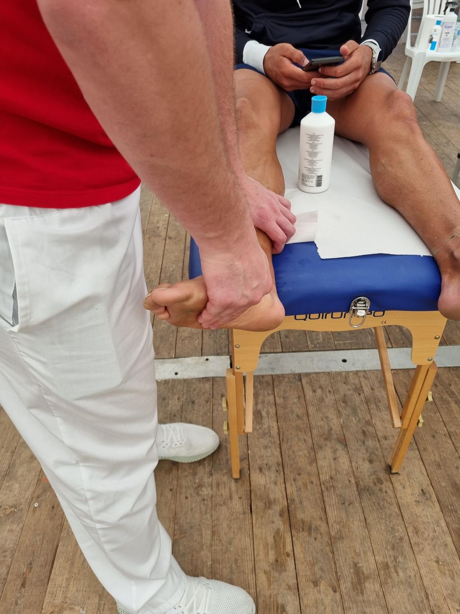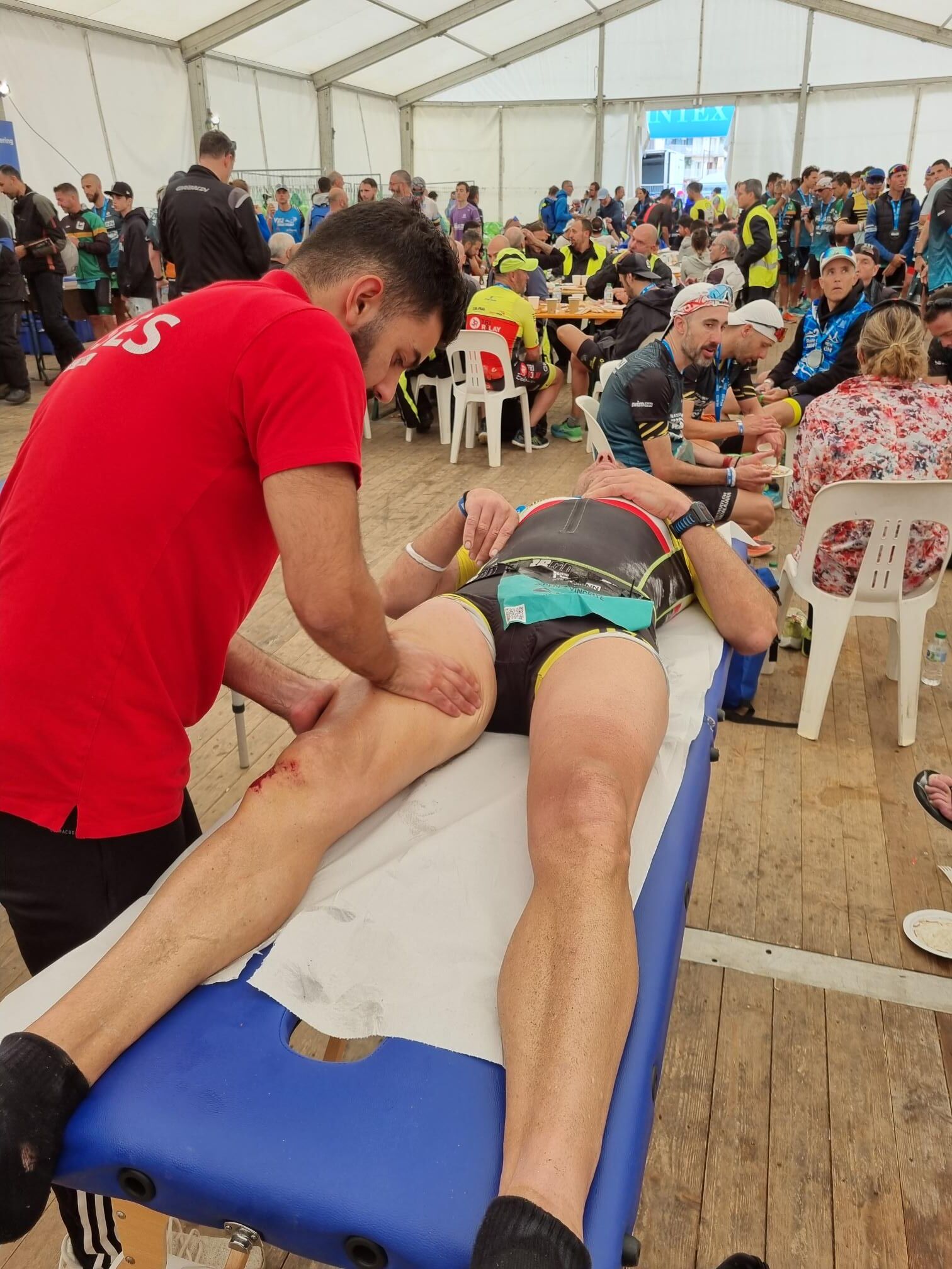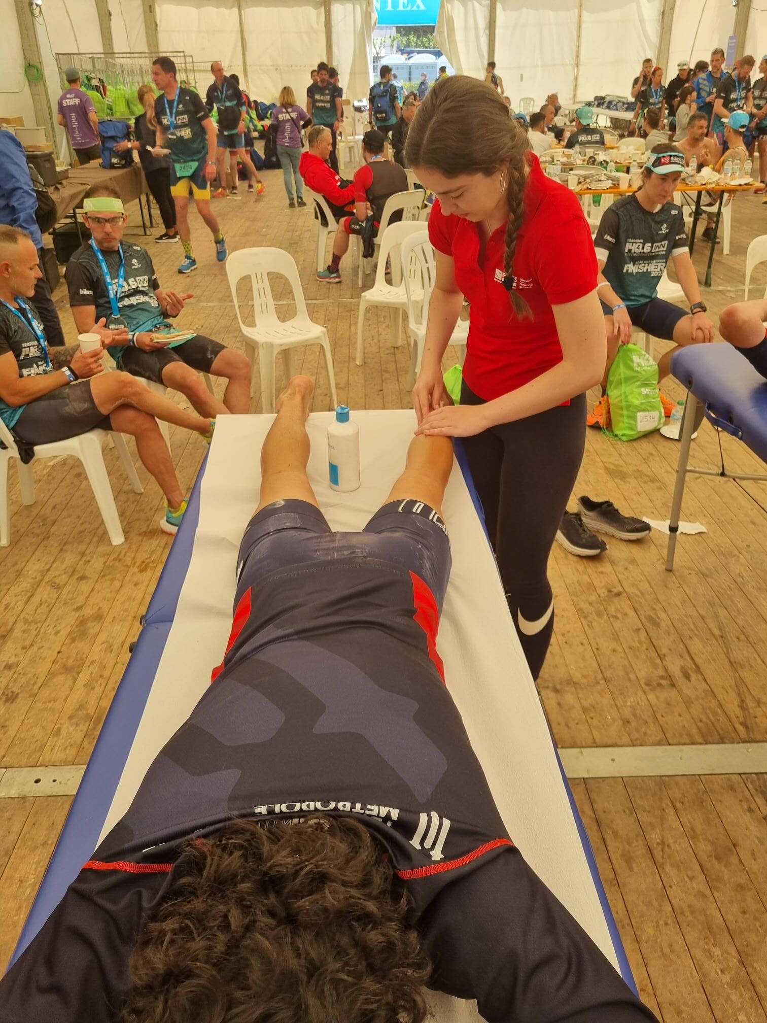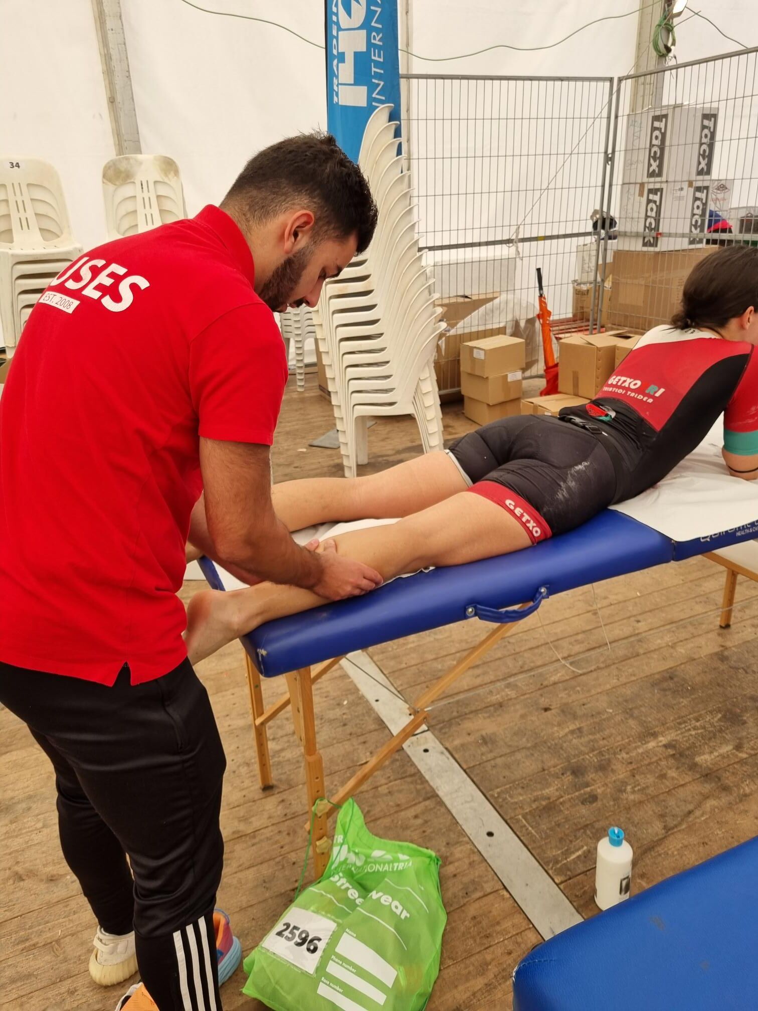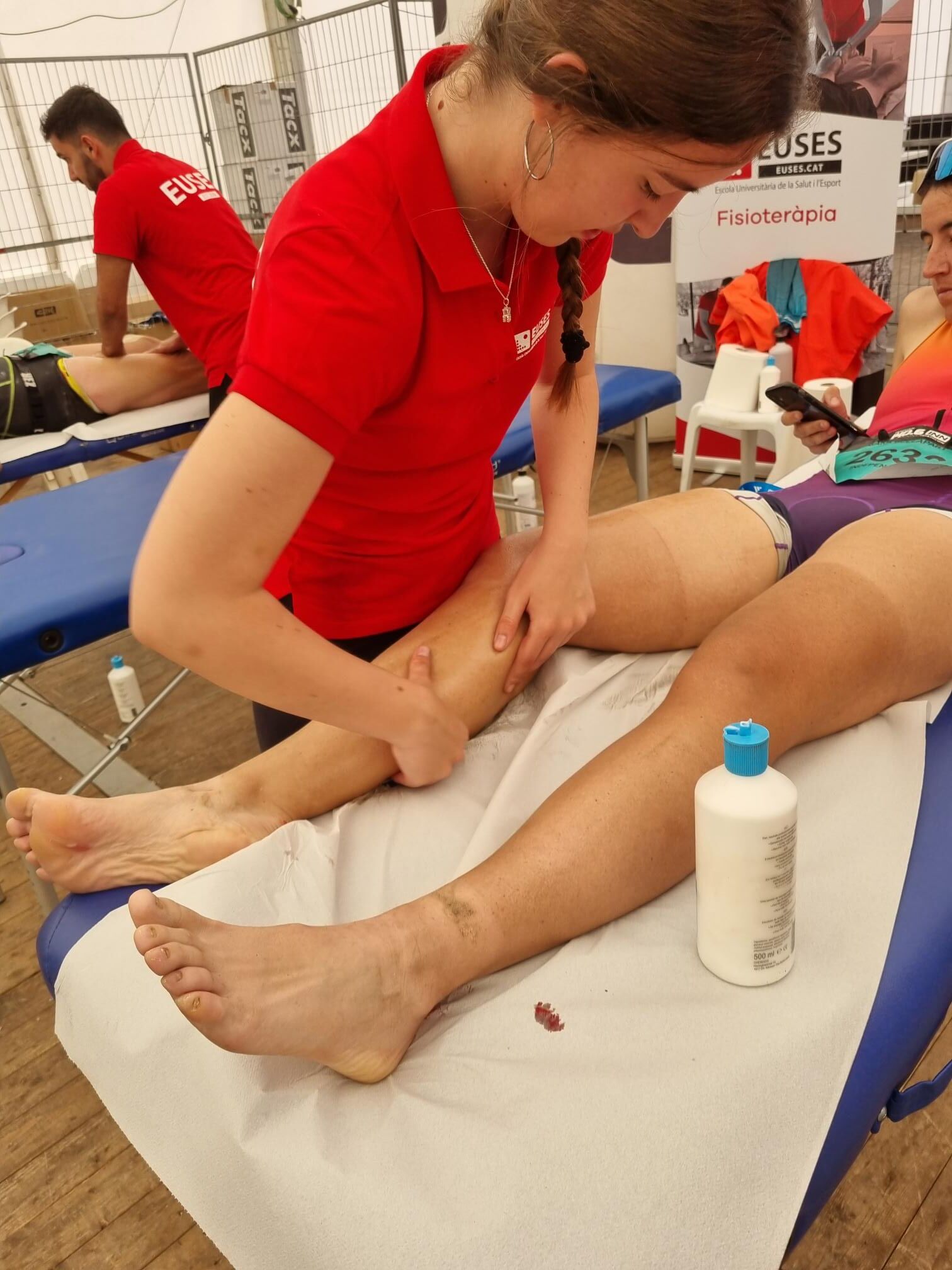 L’Escola Universitària de la Salut i l’Esport s’ha abocat amb la 140.6INN, un esdeveniment organitzat per Tradeinn i que ha constat de quatre triatlons en un mateix cap de setmana. Els més de 1.500 participants han pogut escollir entre quatre recorreguts: Road Full Distance (3,8 quilòmetres de natació, 180 en bicicleta i 42,195 a peu); la Road Half Distance (1,9 quilòmetres de natació, 90 en bicicleta i 21 a peu); la Gravel Half Distance (1,9 quilòmetres de natació, 80 de Gravel i 17 de trail) i la Gravel Olympic Distance (1,5 quilòmetres de natació, 35 de gravel i 10 de trail). Amb el centre neuràlgic a Platja d’Aro i un servei de fisioteràpia convenientment habilitat a prop de l’arribada, el contingent de l’EUSES va vetllar per la recuperació muscular dels participants amb massatges, estiraments i les actuacions fisioteapèutiques pertinents. Hi va haver tres torns, tutoritzats per dos fisioterapeutes de l’EUSES Alumni: David de la Barrera (primer torn de dissabte) i Nerea Álvarez (segon torn de dissabte i torn de diumenge). Els alumnes del Grau que van realitzar el voluntariat van ser: Tom Laubertie, Anna Vila, Eva Morell, Valentín Miranda, Martí Figueres, Lucas Costeque i Júlia Serra.